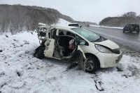 «В 8:05 на 16 километре дороги морпорт – аэропорт 42-летний водитель Honda Fit не справился с управлением, допустил занос машины и выехал на встречную полосу. Там Honda столкнулась с Hino, двигавшимся навстречу под управлением 49-летнего мужчины», — говорится в сообщении.