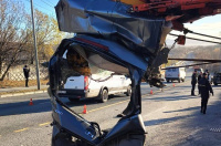 Всё случилось в октябре прошлого года. По версии следствия, водитель крана выехал с второстепенной дороги и не пропустил «Хонду», которая двигалась по главной. Легковушка врезалась в телескопическую стрелу, после чего её отбросило на световую опору.
