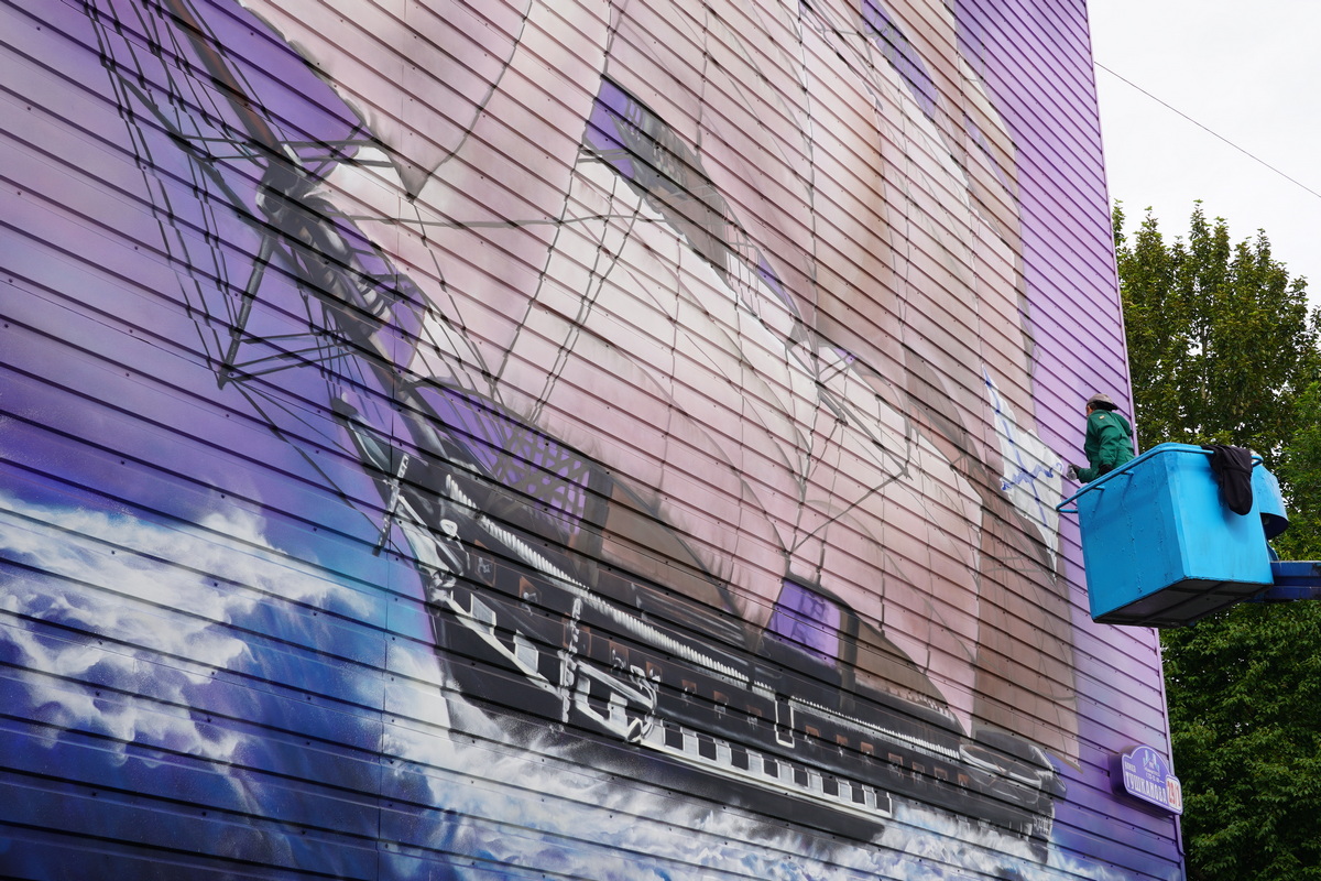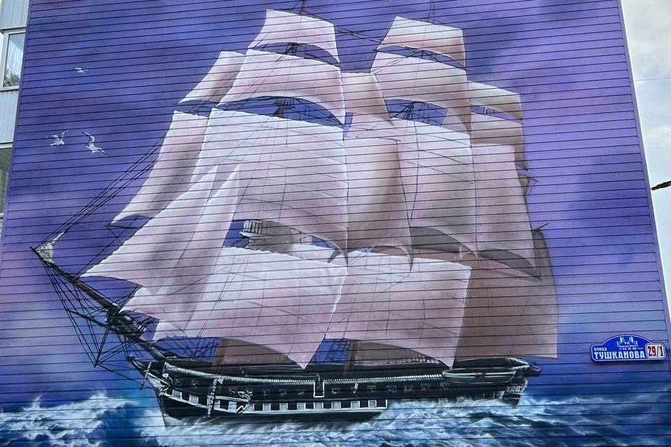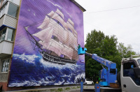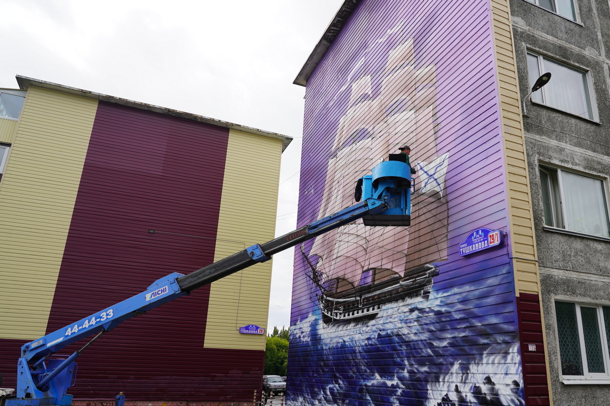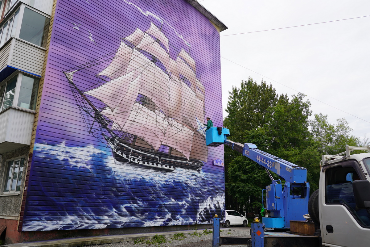 В Петропавловске-Камчатском появился новый мурал на торце дома 29/1 на улице Тушканова. Рисунок под названием «Фрегат "Аврора"» завершает художник из Подмосковного Подольска Илья Демченко.