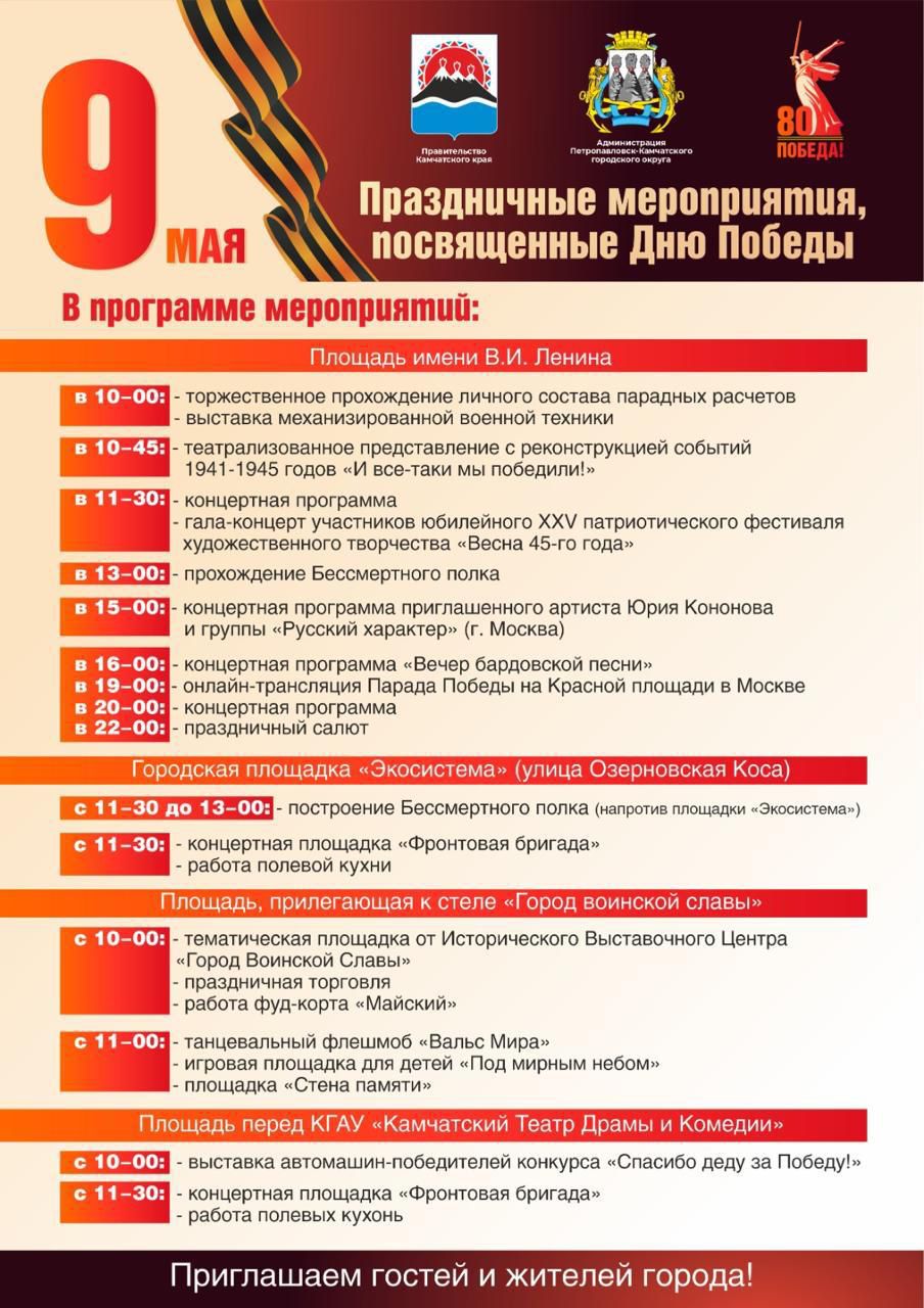 В Петропавловске-Камчатском подготовлена обширная программа празднования 80-летия Победы в Великой Отечественной войне, сообщает ИА «Камчатка» со ссылкой на городскую администрацию.